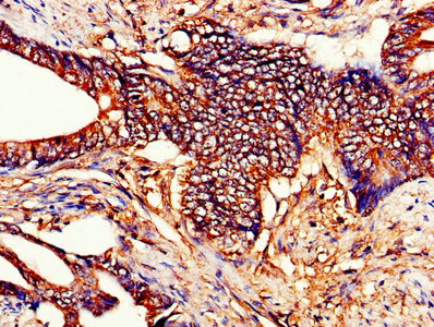 IHC image of CSB-PA006328EA01HU diluted at 1:200 and staining in paraffin-embedded human colon cancer performed on a Leica BondTM system. After dewaxing and hydration, antigen retrieval was mediated by high pressure in a citrate buffer (pH 6.0). Section was blocked with 10% normal goat serum 30min at RT. Then primary antibody (1% BSA) was incubated at 4°C overnight. The primary is detected by a biotinylated secondary antibody and visualized using an HRP conjugated SP system.