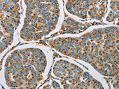The image on the left is immunohistochemistry of paraffin-embedded Human thyroid cancer tissue using CSB-PA591028(CYP11B1 Antibody) at dilution 1/25, on the right is treated with fusion protein. (Original magnification: ×200)