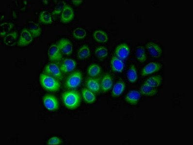 • Immunofluorescent analysis of A549 cells using CSB-PA006392EA01HU at dilution of 1:100 and Alexa Fluor 488-congugated AffiniPure Goat Anti-Rabbit IgG(H+L)
