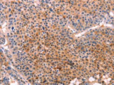 The image on the left is immunohistochemistry of paraffin-embedded Human liver cancer tissue using CSB-PA078505(CYP1B1 Antibody) at dilution 1/20, on the right is treated with fusion protein. (Original magnification: ×200)