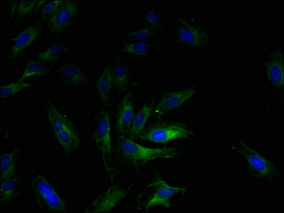 • Immunofluorescent analysis of Hela cells using CSB-PA09047A0Rb at dilution of 1:100 and Alexa Fluor 488-congugated AffiniPure Goat Anti-Rabbit IgG(H+L)