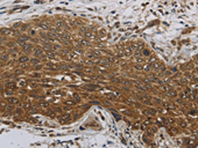 The image on the left is immunohistochemistry of paraffin-embedded Human cervical cancer tissue using CSB-PA210409(DCTN3 Antibody) at dilution 1/70, on the right is treated with fusion protein. (Original magnification: ×200)