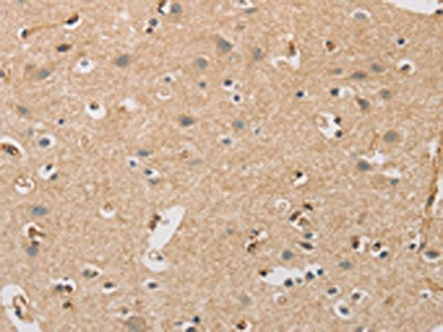 The image on the left is immunohistochemistry of paraffin-embedded Human brain tissue using CSB-PA911773(DCTN5 Antibody) at dilution 1/20, on the right is treated with fusion protein. (Original magnification: ×200)