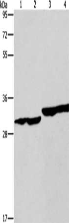 Gel: 8%SDS-PAGE, Lysate: 40 μg, Lane 1-4: Human endometrial carcinoma tissue, Human colon cancer tissue, human fetal liver tissue, PC3 cells, Primary antibody: CSB-PA087606(DECR1 Antibody) at dilution 1/300, Secondary antibody: Goat anti rabbit IgG at 1/8000 dilution, Exposure time: 10 seconds