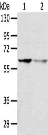 Gel: 8%SDS-PAGE,Lysate: 40 μg,Lane 1-2: Jurkat cells, HepG2 cells,Primary antibody: CSB-PA237947(DHCR24 Antibody) at dilution 1/600 dilution,Secondary antibody: Goat anti rabbit IgG at 1/8000 dilution,Exposure time: 2 minutes
