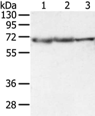 • Gel: 8%SDS-PAGE, Lysate: 40 μg, Lane 1-3: Lncap, hepg2 and A431 cell, Primary antibody: CSB-PA445587(DLAT Antibody) at dilution 1/400 dilution, Secondary antibody: Goat anti rabbit IgG at 1/8000 dilution, Exposure time: 3 seconds