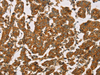 The image on the left is immunohistochemistry of paraffin-embedded Human breast cancer tissue using CSB-PA831848(DLL4 Antibody) at dilution 1/50, on the right is treated with fusion protein. (Original magnification: ×200)