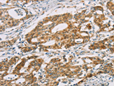 The image on the left is immunohistochemistry of paraffin-embedded Human gastic cancer tissue using CSB-PA184759(DMRT3 Antibody) at dilution 1/25, on the right is treated with fusion protein. (Original magnification: ×200)