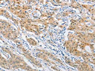 The image on the left is immunohistochemistry of paraffin-embedded Human gastric cancer tissue using CSB-PA183145(DNAJB1 Antibody) at dilution 1/40, on the right is treated with fusion protein. (Original magnification: ×200)
