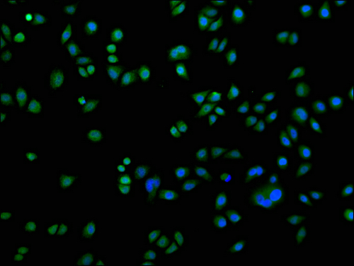 • Immunofluorescence staining of Hela cells with CSB-PA007079LA01HU at 1:200, counter-stained with DAPI. The cells were fixed in 4% formaldehyde and blocked in 10% normal Goat Serum. The cells were then incubated with the antibody overnight at 4°C. The secondary antibody was Alexa Fluor 488-congugated AffiniPure Goat Anti-Rabbit IgG(H+L).