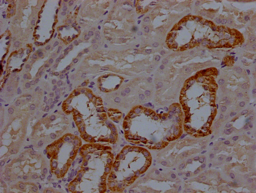 • IHC image of CSB-PA007079LA01HU diluted at 1:200 and staining in paraffin-embedded human kidney tissue performed on a Leica BondTM system. After dewaxing and hydration, antigen retrieval was mediated by high pressure in a citrate buffer (pH 6.0). Section was blocked with 10% normal goat serum 30min at RT. Then primary antibody (1% BSA) was incubated at 4°C overnight. The primary is detected by a Goat anti-rabbit polymer IgG labeled by HRP and visualized using 0.05% DAB.