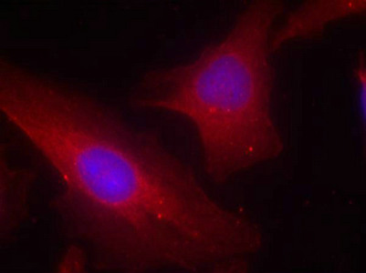 Immunofluorescence staining of methanol-fixed Hela cells using p56Dok-2(Ab-299) Antibody.