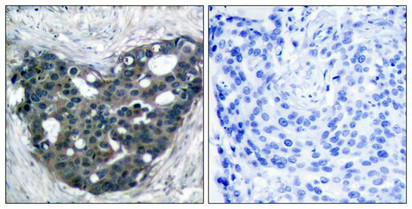 Immunohistochemical analysis of paraffin-embedded human breast carcinoma tissue using p56Dok-2(Ab-299) Antibody(left) or the same antibody preincubated with blocking peptide(right).