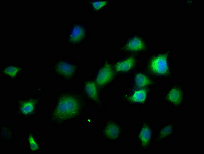 Immunofluorescence staining of SH-SY5Y cells with CSB-PA862001LA01HU at 1:166, counter-stained with DAPI. The cells were fixed in 4% formaldehyde, permeabilized using 0.2% Triton X-100 and blocked in 10% normal Goat Serum. The cells were then incubated with the antibody overnight at 4°C. The secondary antibody was Alexa Fluor 488-congugated AffiniPure Goat Anti-Rabbit IgG(H+L).