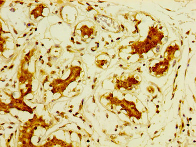 IHC image of CSB-PA769770LA01HU diluted at 1:800 and staining in paraffin-embedded human breast cancer performed on a Leica BondTM system. After dewaxing and hydration, antigen retrieval was mediated by high pressure in a citrate buffer (pH 6.0). Section was blocked with 10% normal goat serum 30min at RT. Then primary antibody (1% BSA) was incubated at 4°C overnight. The primary is detected by a biotinylated secondary antibody and visualized using an HRP conjugated SP system.