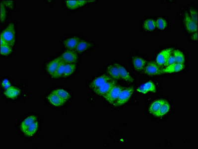 Immunofluorescent analysis of HepG2 cells using CSB-PA622516LA01HU at dilution of 1:100 and Alexa Fluor 488-congugated AffiniPure Goat Anti-Rabbit IgG(H+L)