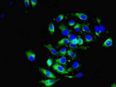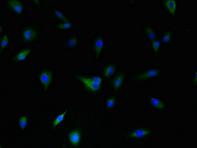 • Immunofluorescent analysis of U87 cells using CSB-PA007182EA01HU at dilution of 1:100 and Alexa Fluor 488-congugated AffiniPure Goat Anti-Rabbit IgG(H+L)