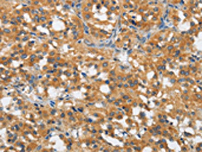 The image on the left is immunohistochemistry of paraffin-embedded Human thyroid cancer tissue using CSB-PA559099(DTNBP1 Antibody) at dilution 1/20, on the right is treated with synthetic peptide. (Original magnification: ×200)