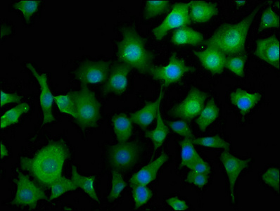 • Immunofluorescence staining of SH-SY5Y cells with CSB-PA839833LA01HU at 1:50, counter-stained with DAPI. The cells were fixed in 4% formaldehyde, permeabilized using 0.2% Triton X-100 and blocked in 10% normal Goat Serum. The cells were then incubated with the antibody overnight at 4°C. The secondary antibody was Alexa Fluor 488-congugated AffiniPure Goat Anti-Rabbit IgG(H+L).