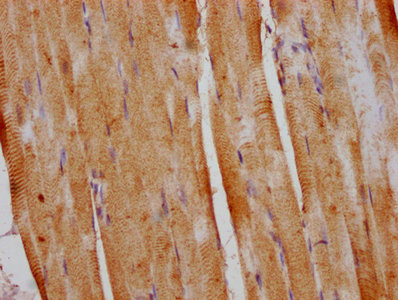 IHC image of CSB-PA734923HA01HU diluted at 1:400 and staining in paraffin-embedded human skeletal muscle tissue performed on a Leica BondTM system. After dewaxing and hydration, antigen retrieval was mediated by high pressure in a citrate buffer (pH 6.0). Section was blocked with 10% normal goat serum 30min at RT. Then primary antibody (1% BSA) was incubated at 4°C overnight. The primary is detected by a biotinylated secondary antibody and visualized using an HRP conjugated SP system.