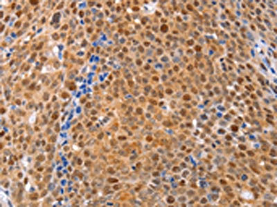 The image on the left is immunohistochemistry of paraffin-embedded Human ovarian cancer tissue using CSB-PA921264(DUSP4 Antibody) at dilution 1/30, on the right is treated with fusion protein. (Original magnification: ×200)