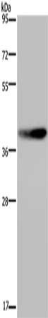 Gel: 10%SDS-PAGE, Lysate: 30 μg, Lane: RAW264.7 cells, Primary antibody: CSB-PA921264(DUSP4 Antibody) at dilution 1/600, Secondary antibody: Goat anti rabbit IgG at 1/8000 dilution, Exposure time: 1 minute