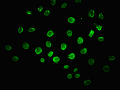 Immunofluorescence staining of A549 cells with CSB-PA620976LA01HU at 1:100, counter-stained with DAPI. The cells were fixed in 4% formaldehyde, permeabilized using 0.2% Triton X-100 and blocked in 10% normal Goat Serum. The cells were then incubated with the antibody overnight at 4°C. The secondary antibody was Alexa Fluor 488-congugated AffiniPure Goat Anti-Rabbit IgG(H+L).