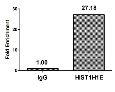 • Chromatin Immunoprecipitation Hela (4*106) were treated with Micrococcal Nuclease, sonicated, and immunoprecipitated with 5µg anti-HIST1H1E (CSB-PA010380PA16me2HU) or a control normal rabbit IgG. The resulting ChIP DNA was quantified using real-time PCR with primers against the β-Globin promoter.