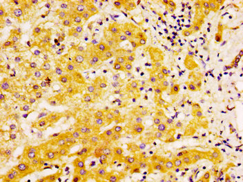 IHC image of CSB-PA892357LA01HU diluted at 1:500 and staining in paraffin-embedded human liver cancer performed on a Leica BondTM system. After dewaxing and hydration, antigen retrieval was mediated by high pressure in a citrate buffer (pH 6.0). Section was blocked with 10% normal goat serum 30min at RT. Then primary antibody (1% BSA) was incubated at 4°C overnight. The primary is detected by a biotinylated secondary antibody and visualized using an HRP conjugated SP system.