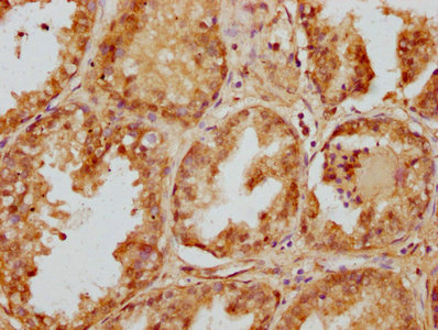 IHC image of CSB-PA838793LA01HU diluted at 1:200 and staining in paraffin-embedded human prostate cancer performed on a Leica BondTM system. After dewaxing and hydration, antigen retrieval was mediated by high pressure in a citrate buffer (pH 6.0). Section was blocked with 10% normal goat serum 30min at RT. Then primary antibody (1% BSA) was incubated at 4°C overnight. The primary is detected by a biotinylated secondary antibody and visualized using an HRP conjugated SP system.