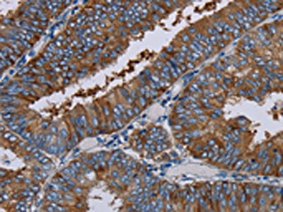 • The image on the left is immunohistochemistry of paraffin-embedded Human colon cancer tissue using CSB-PA093669(EDNRB Antibody) at dilution 1/30, on the right is treated with synthetic peptide. (Original magnification: ×200)