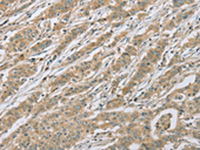 The image on the left is immunohistochemistry of paraffin-embedded Human gastic cancer tissue using CSB-PA090786(EEF2 Antibody) at dilution 1/20, on the right is treated with fusion protein. (Original magnification: ×200)