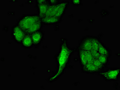 Immunofluorescent analysis of HepG2 cells using CSB-PA007510LA01HU at dilution of 1:100 and Alexa Fluor 488-congugated AffiniPure Goat Anti-Rabbit IgG(H+L)