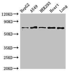 Positive WB detected in: HepG2 whole cell lysate, A549 whole cell lysate, HEK293 whole cell lysate, Rat heart tissue, Rat lung tissue