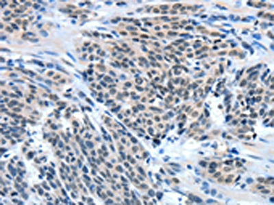 The image on the left is immunohistochemistry of paraffin-embedded Human esophagus cancer tissue using CSB-PA087889(EIF4EBP1 Antibody) at dilution 1/50, on the right is treated with fusion protein. (Original magnification: ×200)