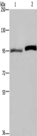 • Gel: 6%SDS-PAGE, Lysate: 40 μg, Lane 1-2: LoVo cells, Hela cells, Primary antibody: CSB-PA997561(ELAC2 Antibody) at dilution 1/250, Secondary antibody: Goat anti rabbit IgG at 1/8000 dilution, Exposure time: 1 minute