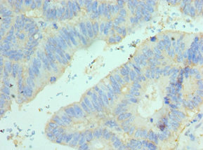 Immunohistochemistry of paraffin-embedded human colon cancer using CSB-PA857453ESR2HU at dilution of 1:100