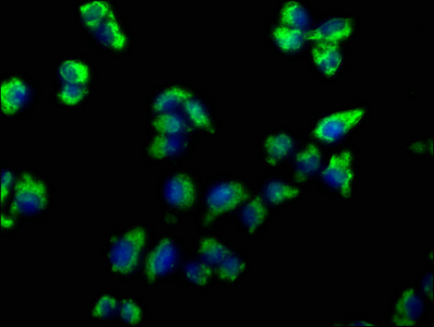 • Immunofluorescence staining of Hela cells with CSB-PA023887OA01HU at 1:66, counter-stained with DAPI. The cells were fixed in 4% formaldehyde, permeabilized using 0.2% Triton X-100 and blocked in 10% normal Goat Serum. The cells were then incubated with the antibody overnight at 4°C. The secondary antibody was Alexa Fluor 488-congugated AffiniPure Goat Anti-Rabbit IgG(H+L).