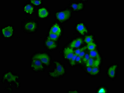 Immunofluorescence staining of MCF-7 cells with CSB-PA10799A0Rb at 1:133, counter-stained with DAPI. The cells were fixed in 4% formaldehyde, permeabilized using 0.2% Triton X-100 and blocked in 10% normal Goat Serum. The cells were then incubated with the antibody overnight at 4°C. The secondary antibody was Alexa Fluor 488-congugated AffiniPure Goat Anti-Rabbit IgG(H+L).