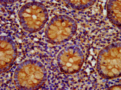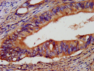 IHC image of CSB-PA10799A0Rb diluted at 1:400 and staining in paraffin-embedded human colon cancer performed on a Leica BondTM system. After dewaxing and hydration, antigen retrieval was mediated by high pressure in a citrate buffer (pH 6.0). Section was blocked with 10% normal goat serum 30min at RT. Then primary antibody (1% BSA) was incubated at 4°C overnight. The primary is detected by a biotinylated secondary antibody and visualized using an HRP conjugated SP system.