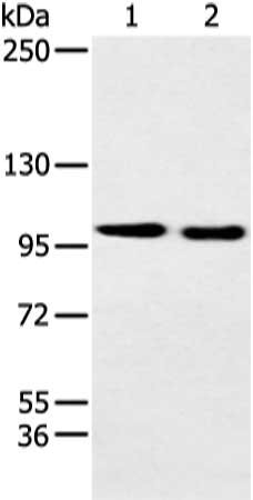 Gel: 6%SDS-PAGE, Lysate: 40 μg, Lane 1-2: Hela and 231 cell, Primary antibody: CSB-PA637350(EPHB3 Antibody) at dilution 1/250 dilution, Secondary antibody: Goat anti rabbit IgG at 1/8000 dilution, Exposure time: 20 seconds