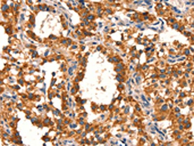 • The image on the left is immunohistochemistry of paraffin-embedded Human thyroid cancer tissue using CSB-PA237202(EPO Antibody) at dilution 1/25, on the right is treated with synthetic peptide. (Original magnification: ×200)