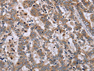 The image on the left is immunohistochemistry of paraffin-embedded Human liver cancer tissue using CSB-PA964117(EPSTI1 Antibody) at dilution 1/40, on the right is treated with fusion protein. (Original magnification: ×200)