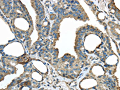 • The image on the left is immunohistochemistry of paraffin-embedded Human thyroid cancer tissue using CSB-PA233073(ERP44 Antibody) at dilution 1/30, on the right is treated with fusion protein. (Original magnification: ×200)