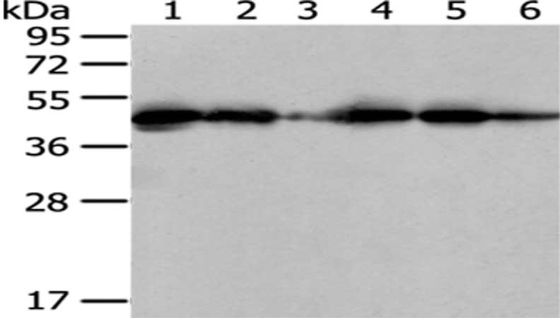 • Gel: 8%SDS-PAGE, Lysate: 40 μg, Lane 1-6: 231, hela, hepg2, A431, K562 and Raji cell, Primary antibody: CSB-PA233073(ERP44 Antibody) at dilution 1/400 dilution, Secondary antibody: Goat anti rabbit IgG at 1/8000 dilution, Exposure time: 20 seconds