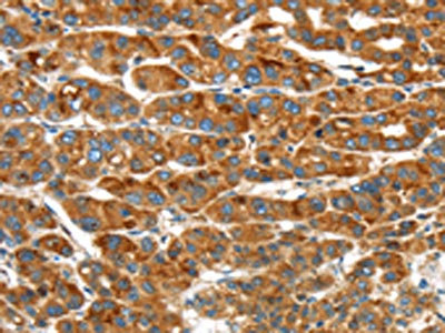 The image on the left is immunohistochemistry of paraffin-embedded Human liver cancer tissue using CSB-PA580639(ERP44 Antibody) at dilution 1/20, on the right is treated with synthetic peptide. (Original magnification: ×200)