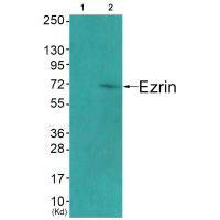 • Western blot analysis of extracts from COS7 cells (Lane 2), using Ezrin (Ab-478) antiobdy. The lane on the left is treated with synthesized peptide.