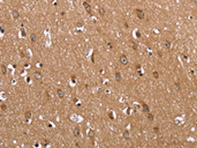 The image on the left is immunohistochemistry of paraffin-embedded Human brain tissue using CSB-PA170264(FABP6 Antibody) at dilution 1/30, on the right is treated with fusion protein. (Original magnification: ×200)