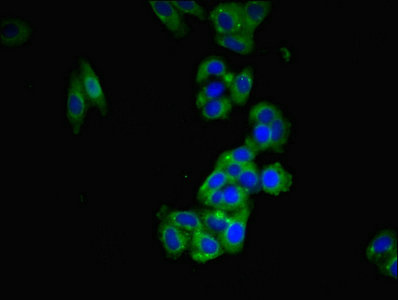 Immunofluorescent analysis of HepG2 cells using CSB-PA757601LA01HU at dilution of 1:100 and Alexa Fluor 488-congugated AffiniPure Goat Anti-Rabbit IgG(H+L)