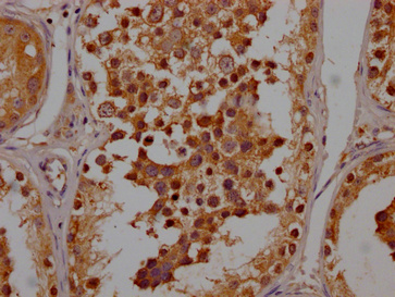 IHC image of CSB-PA843275LA01HU diluted at 1:200 and staining in paraffin-embedded human testis tissue performed on a Leica BondTM system. After dewaxing and hydration, antigen retrieval was mediated by high pressure in a citrate buffer (pH 6.0). Section was blocked with 10% normal goat serum 30min at RT. Then primary antibody (1% BSA) was incubated at 4°C overnight. The primary is detected by a Goat anti-rabbit polymer IgG labeled by HRP and visualized using 0.05% DAB.